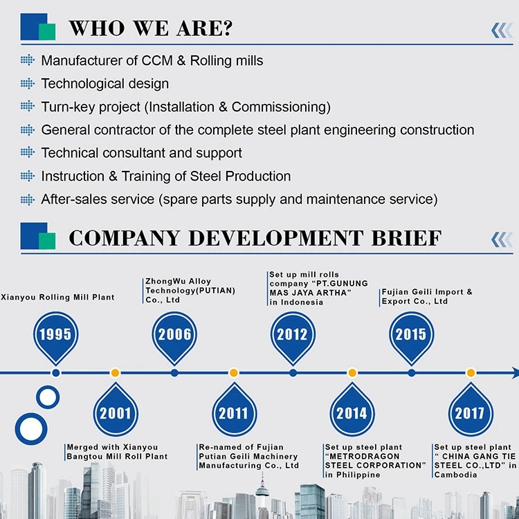 FUJIAN PUTIAN GEILI MACHINERY MANUFACTURING CO.,LTDwas founded in 1995,formerly known as Xianyou Rolling Mill Manufacturer.In 2001,merged with Xianyou Bangtou Mill Roll Manufacturer. In 2008,we focused on continuous casting and rolling production line equipment. In 2011,the company reorganized and established FUJIAN PUTIAN GEILI MACHINERY MANUFACT能有限公司,从事冶金情商uipment,mainly in steel-making,continuous casting and complete rolling production line research and development,design,manufacturing,installation and general contracting services.